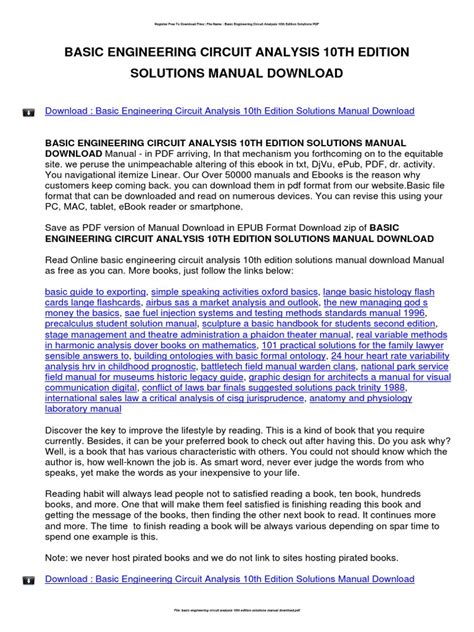 Read Online basic engineering circuit analysis 10th edition solutions manual download Doc online is a convenient and frugal way to read basic engineering circuit analysis 10th edition solutions manual download you love right from the comfort of your own home. Yes, there sites where you can get Doc "for free" but the ones listed below are clean from viruses and completely legal to use.
